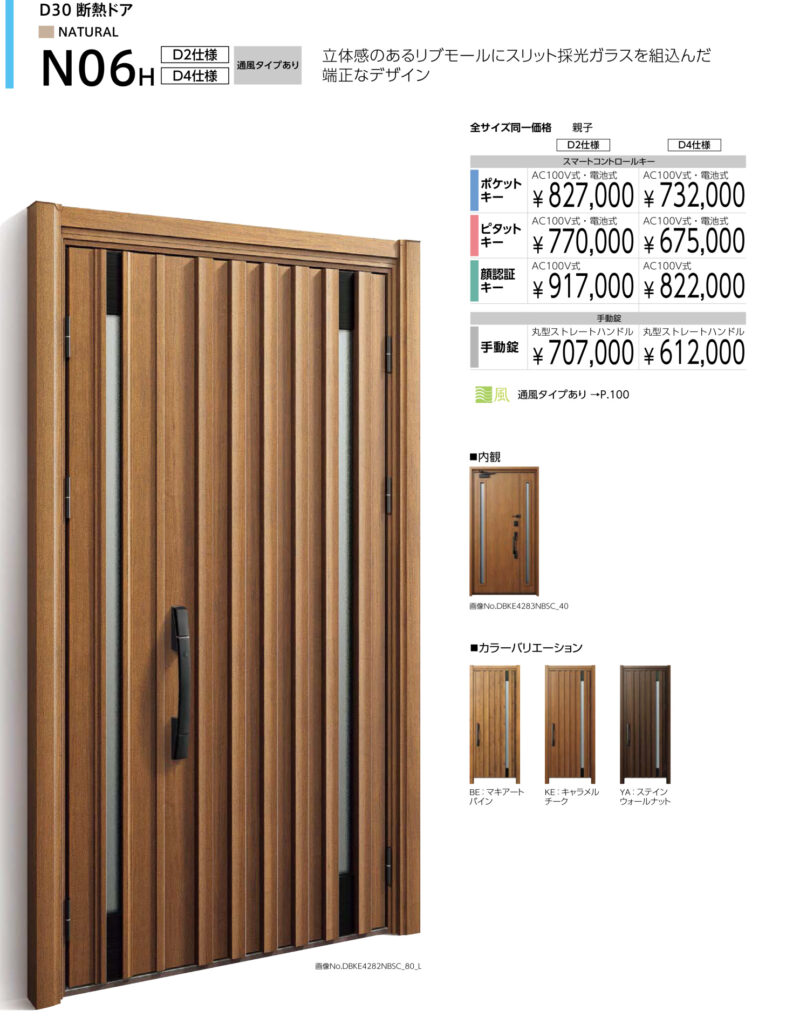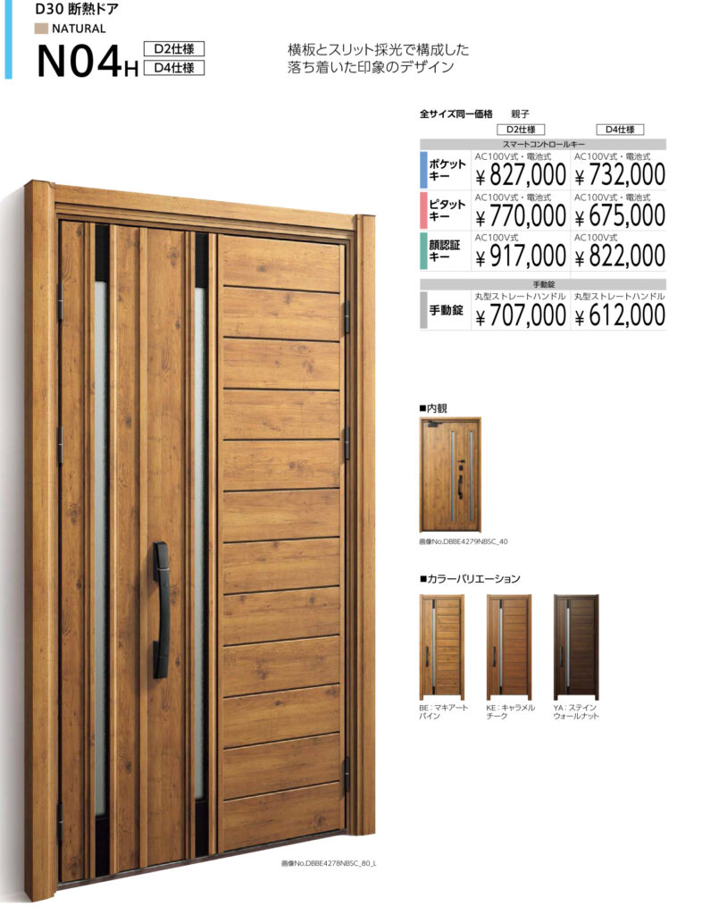 ちなみに断熱仕様のD4・D2の違いは、ドアの厚さは42mmと同じですが、枠の断熱構造が異なる(D4はアルミ形材枠、D2は辺縁部熱遮断構造)のと、採光ガラスが異なる(D4は複層ガラス、D2はLow-E複層ガラス)ので、D2のほうがより断熱性に優れています。