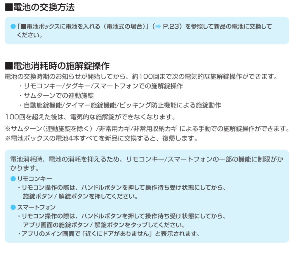 ところが、リモコンキーや本体は電池で動いていることを忘れて電池交換をしないまま使ってしまって、ある日突然施解錠ができなくなる、という現象が起こっています。(電子キーがAC電源式の場合もあります)
