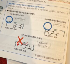 2. 半開で使用する際は、右勝手の窓の場合は室内から見て右側の窓を開ける方が虫が入りにくいこと。