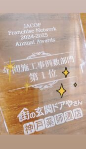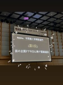 この度、玄関ドア専門窓口である 街の玄関ドア屋さん神戸薬師通店が、年間施工事例数部門で第1位を受賞 し、東京にて表彰していただきました!