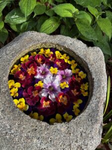 花手水(はなちょうず)とは、もともと神社や寺院の手水舎に水の代わりに色とりどりの花を浮かべて参拝者の心を和ませる演出で、見た目の美しさだけでなく“清め”の意味も持つ日本の文化だとか。