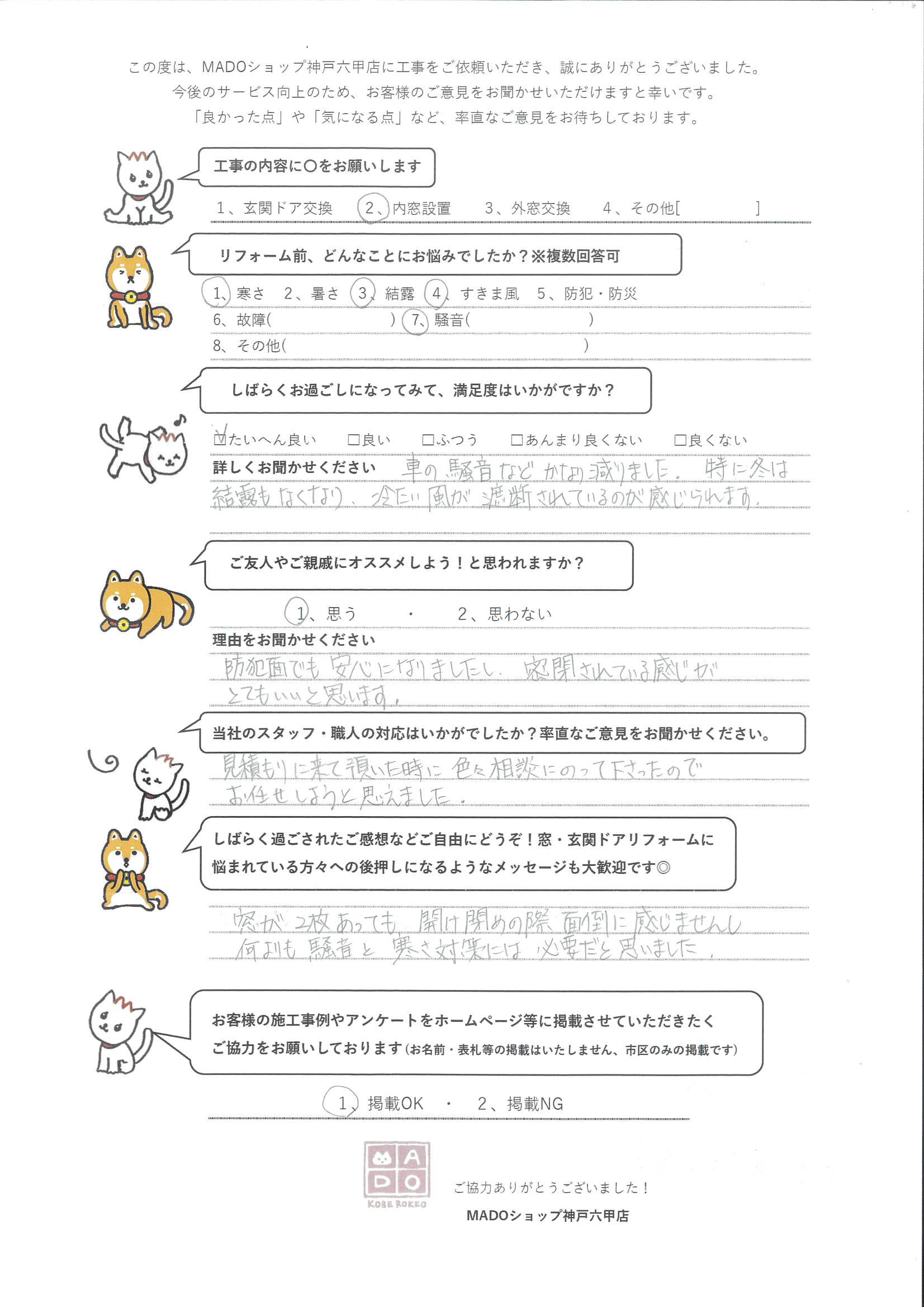 車の騒音などかなり減りました。特に冬は結露も無くなり、冷たい風が遮断されているのが感じられます。