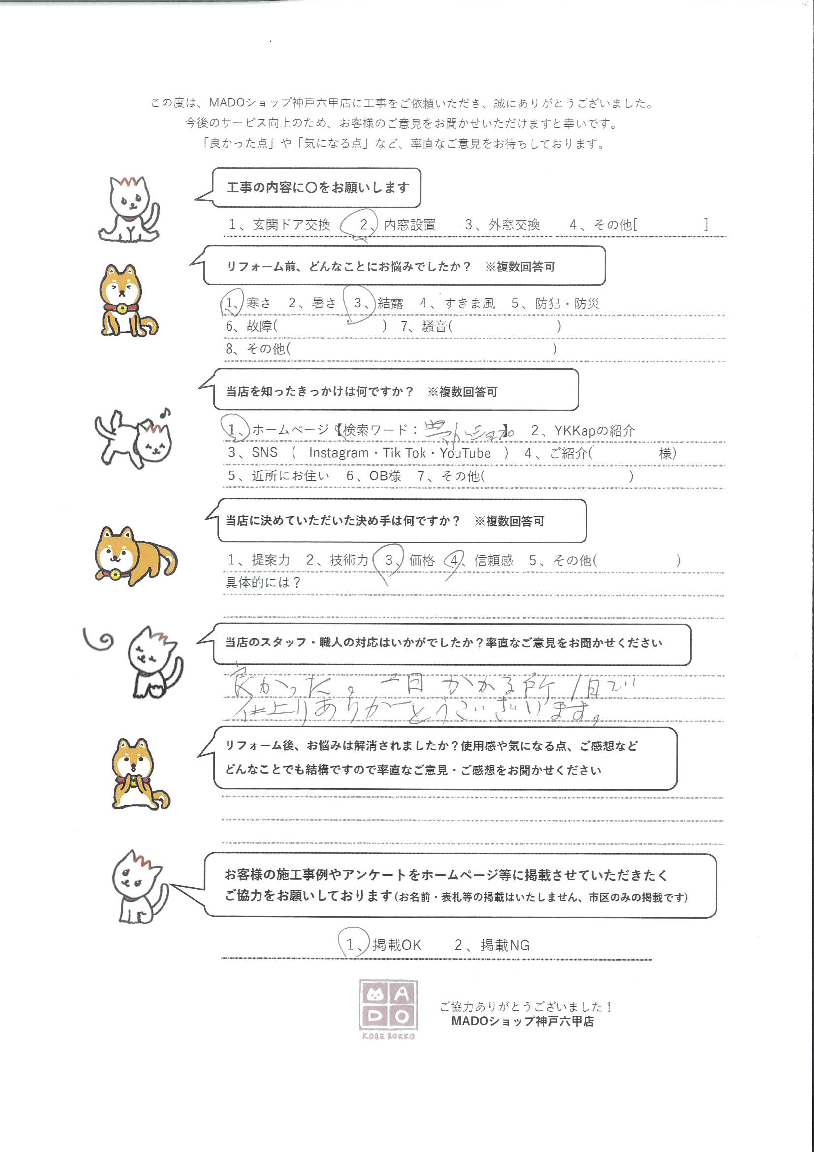 神戸市北区 戸建てをまるっと内窓施工👊✨✨✨~お客様の声~ 14窓を1日で完工できました😆もちろん丁寧に仕上げています! 工事の内容 内窓設置 ・リフォーム前、どんなことにお悩みでしたか? 寒さ・結露 ・当店を知ったきっかけは何ですか? ホームページ【検索ワード:マドショップ】 ・当店に決めていただいた決め手は何ですか? 価格・信頼感 ・当店のスタッフ・職人の対応はいかがでしたか?率直なご意見をお聞かせください。 良かった。2日かかるところ、1日で仕上がり、ありがとうございます。 ORDER このお客様の施工内容 40万円(税込) 戸建て14窓に内窓を施工!この冬が楽しみですね♪ 防犯施工箇所から選ぶ内窓補助金活用 前の記事 次の記事 一覧へ戻る