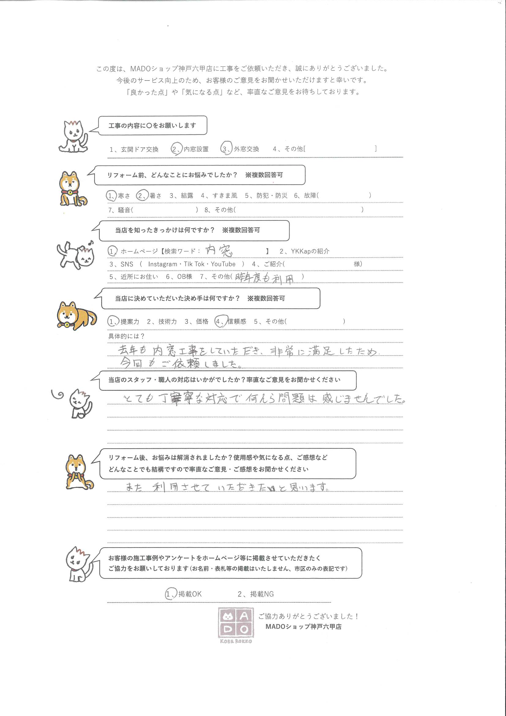 去年も内窓工事をしていただき、非常に満足したため今回もご依頼しました。