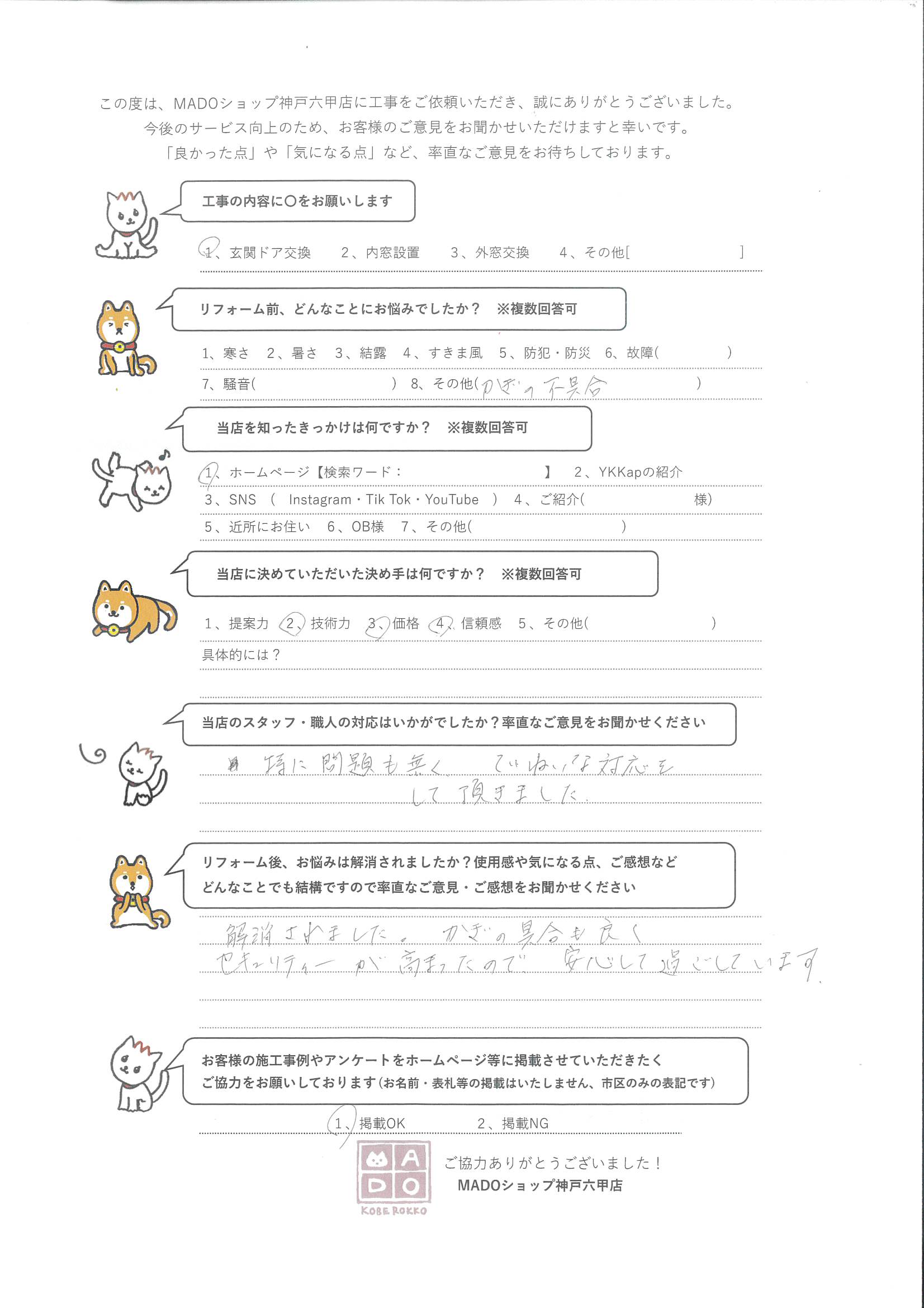 西宮市 縁起の良い唐草模様の魅力が光る、玄関ドアリフォーム🚪~お客様の声~ 鍵の不具合をスマートキーが華麗に解決✨ ●工事の内容: 玄関ドア交換 ●リフォーム前、どんなことにお悩みでしたか? 鍵の不具合 ●当店を知ったきっかけは何ですか? ホームページ ●当店に決めていただいた決め手は何ですか? 技術力、価格、信頼感 ●当店のスタッフ・職人の対応はいかがでしたか?率直なご意見をお聞かせください。 特に問題もなく、丁寧な対応をしていただきました ●リフォーム後、お悩みは解消されましたか?使用感・ご感想などお聞かせください。 解消されました。鍵の具合もよく、セキュリティーが高まったので安心して過ごしています。 ORDER このお客様の施工内容 37万円(税込) 鍵の不具合がきっかけで、最新の電子キーの玄関ドアを手に入れました♪ 防犯玄関ドア 前の記事 次の記事 一覧へ戻る