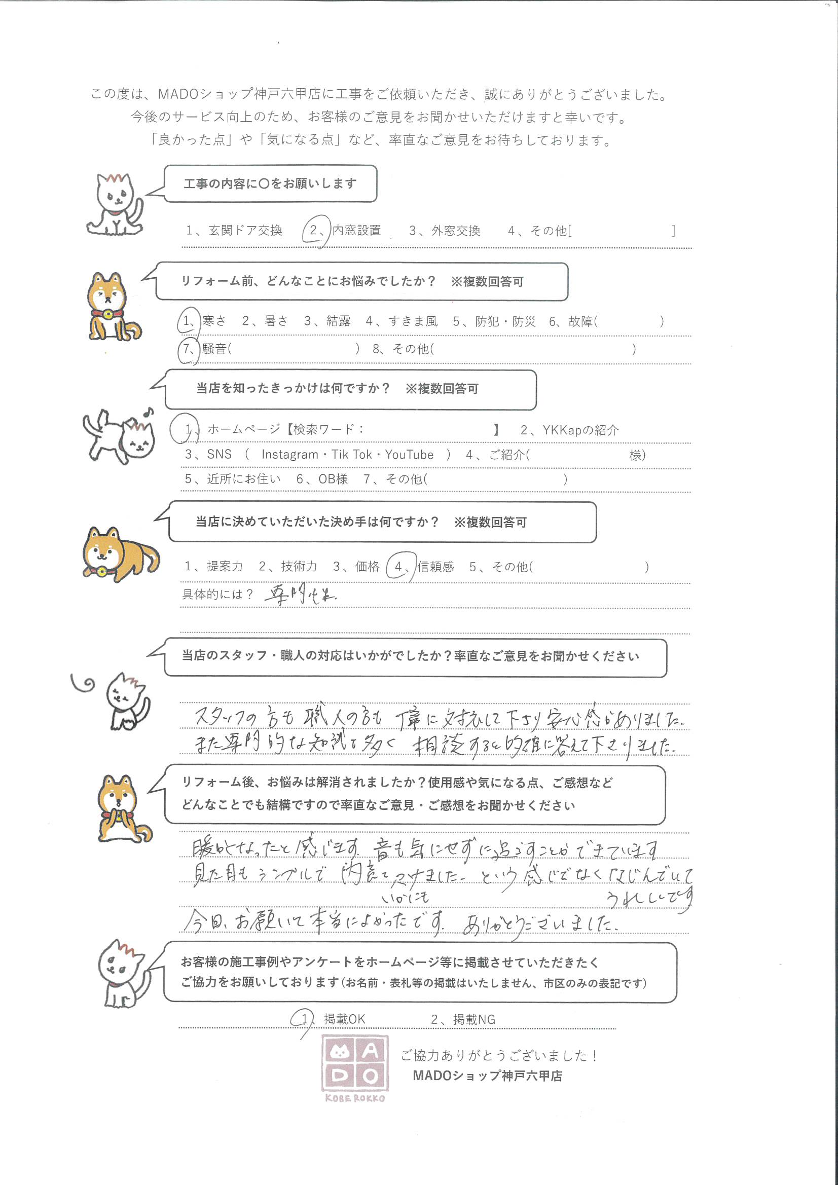 暖かくなったと感じます。音も気にせずに過ごすことができています。見た目もシンプルで内窓をいかにもつけましたという感じではなくなじんでいてうれしいです。今回お願いして本当に良かったです。ありがとうございました。