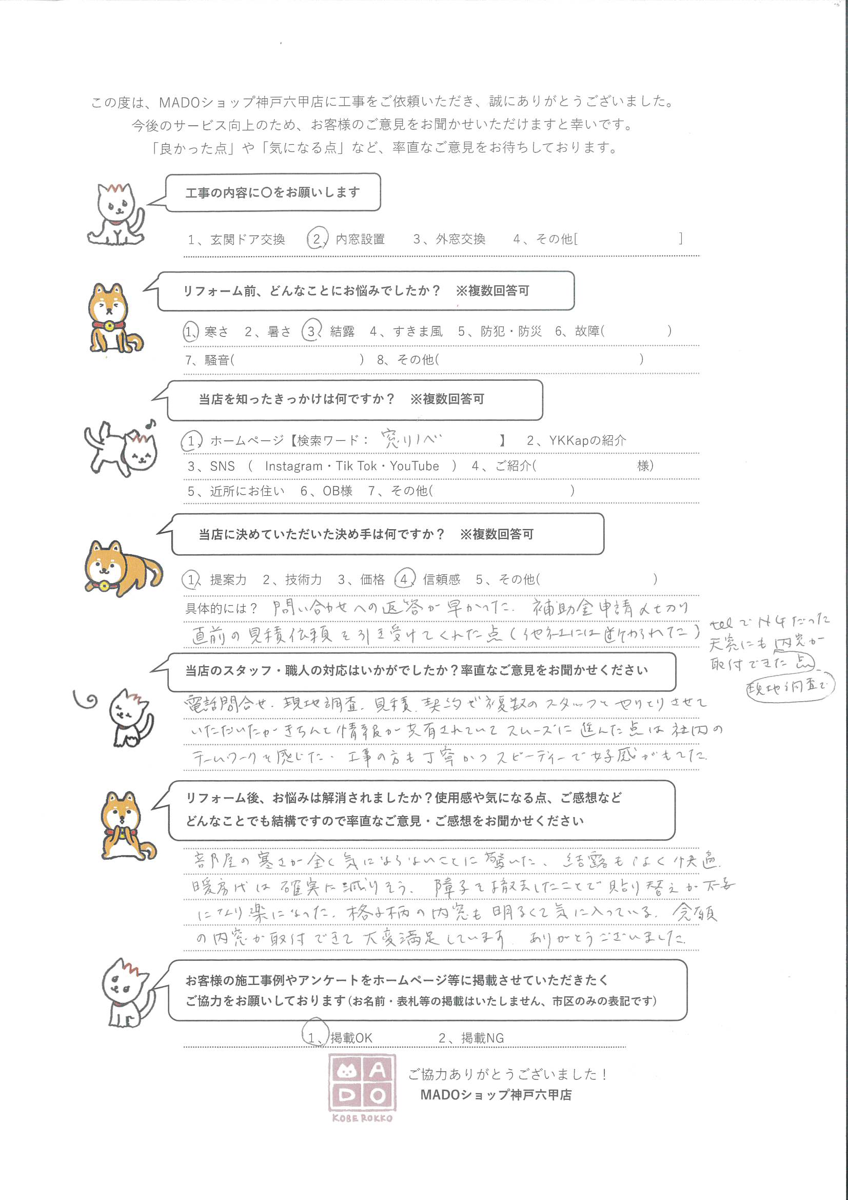 部屋の寒さが全く気にならないことに驚いた。結露もなく快適に。暖房代は確実に減りそう。障子を撤去していただいたことで張替えが不要になり楽になった。格子柄の天窓も明るくて気に入っている。念願の内窓が取り付け出来て大変満足しています。ありがとうございました。