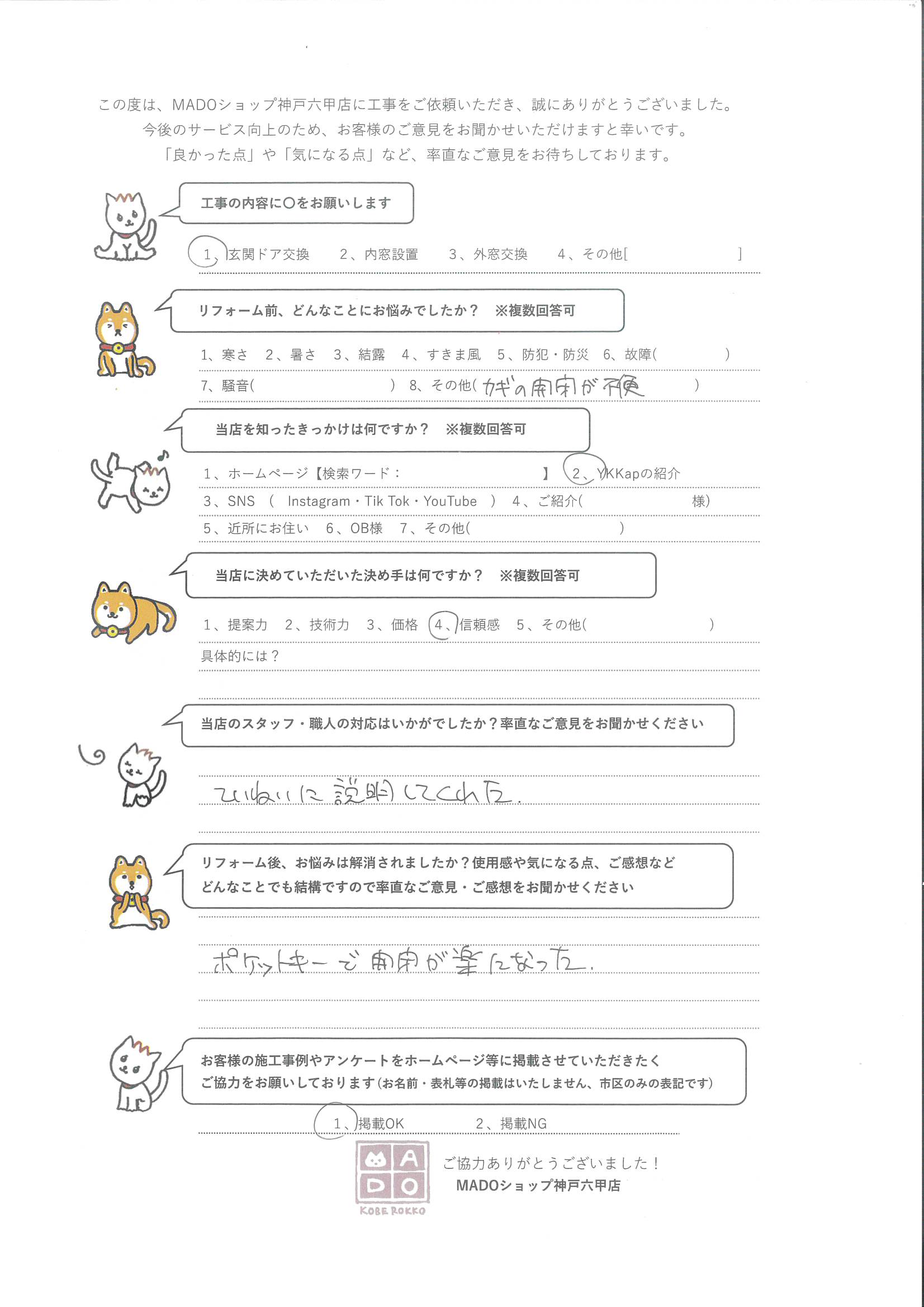 神戸市須磨区 「ポケットキーにして正解でした!」ドア交換の施工事例*YKKAPのD30シリーズ~お客様の声~ 横板とスリット採光で構成した落ち着いた印象のデザインドア。 ●工事の内容: 玄関ドア交換 ●リフォーム前、どんなことにお悩みでしたか? 鍵の開閉が不便 ●当店を知ったきっかけは何ですか? YKKAPの紹介 ●当店に決めていただいた決め手は何ですか? 信頼感 ●当店のスタッフ・職人の対応はいかがでしたか?率直なご意見をお聞かせください。 ていねいに説明してくれた ●リフォーム後、お悩みは解消されましたか?使用感・ご感想などお聞かせください。 ポケットキーで開閉が楽になった ORDER このお客様の施工内容 35.7万円(税込) 横板とスリット採光で構成した落ち着いた印象のデザインドア。 施工箇所から選ぶ玄関ドア 前の記事 一覧へ戻る