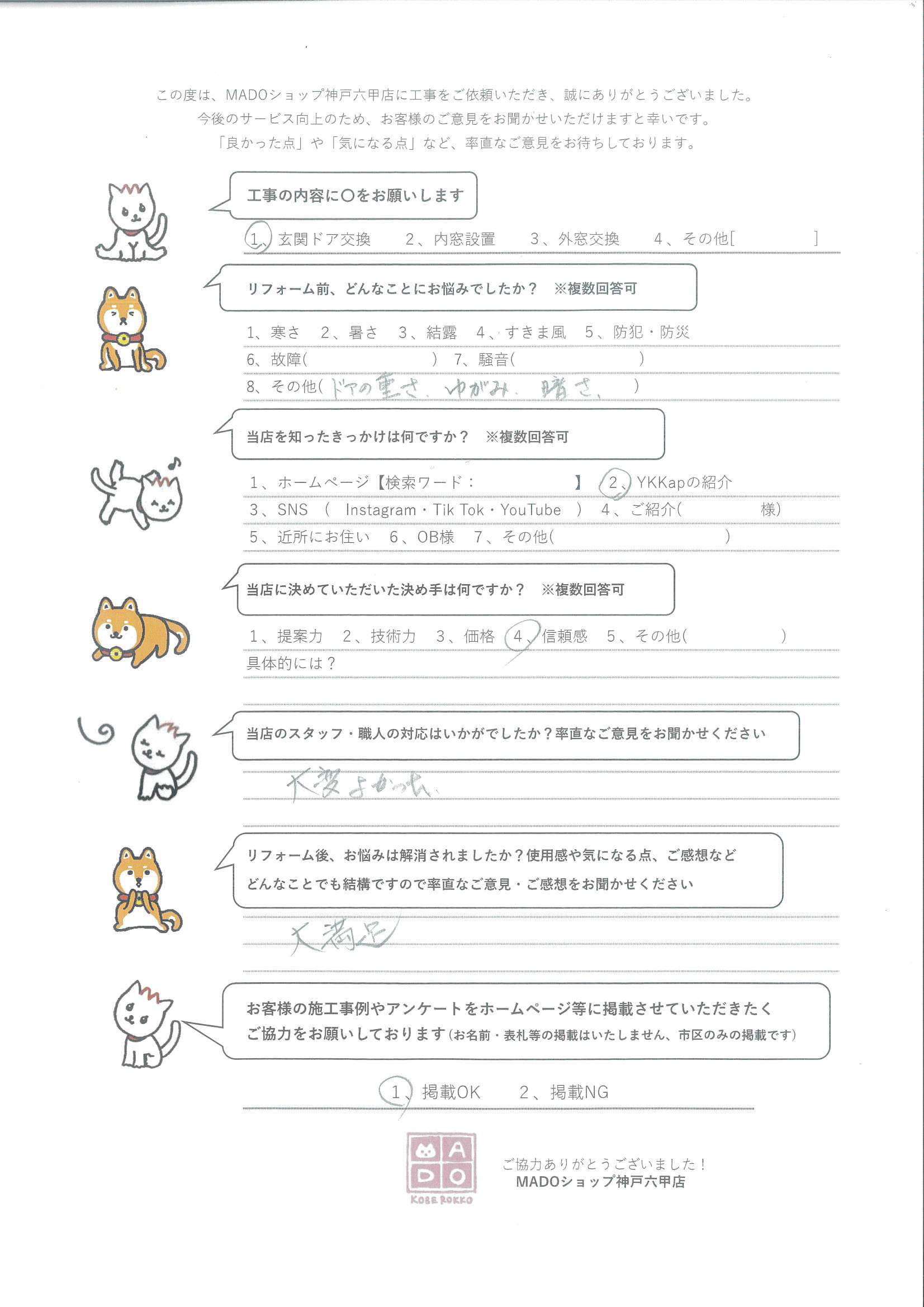 神戸市西区 古いドアを思い切って刷新!本気の断熱D2仕様のピカピカドアに大満足。【YKKAPのD30シリーズ】~お客様の声~ 「大満足」のドアリフォームです♪ ●工事の内容: 玄関ドア交換 ●リフォーム前、どんなことにお悩みでしたか? ドアの重さ、ゆがみ、暗さ ●当店を知ったきっかけは何ですか? YKKAPの紹介 ●当店に決めていただいた決め手は何ですか? 信頼感 ●当店のスタッフ・職人の対応はいかがでしたか?率直なご意見をお聞かせください。 大変良かった ●リフォーム後、お悩みは解消されましたか?使用感・ご感想などお聞かせください。 大満足 ORDER このお客様の施工内容 49.2万円(税込) 「大満足」のドアリフォームです♪ 玄関ドア 前の記事 一覧へ戻る