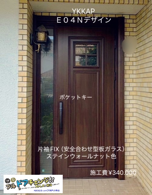 | 使用商材・建材 | ◎YKKapドアリモ 断熱ドアD30 E04Nデザイン/D4仕様/片袖FIX/ポケットキー/ステインウォールナット色/LowーE複層安全合わせ型板ガラス |