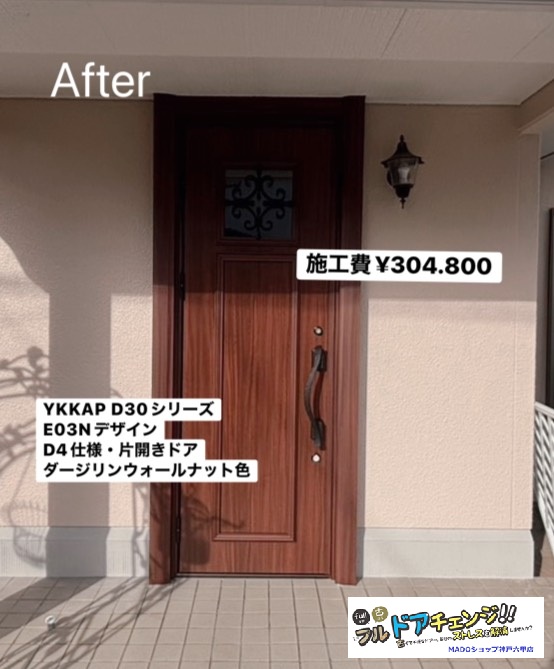 | 使用商材・建材 | ◎YKKAP 玄関ドアD4仕様/E03Nデザイン/片開き/手動錠/ダージリンウォールナット色 ◎YKKAP ラチス格子/ホワイト |