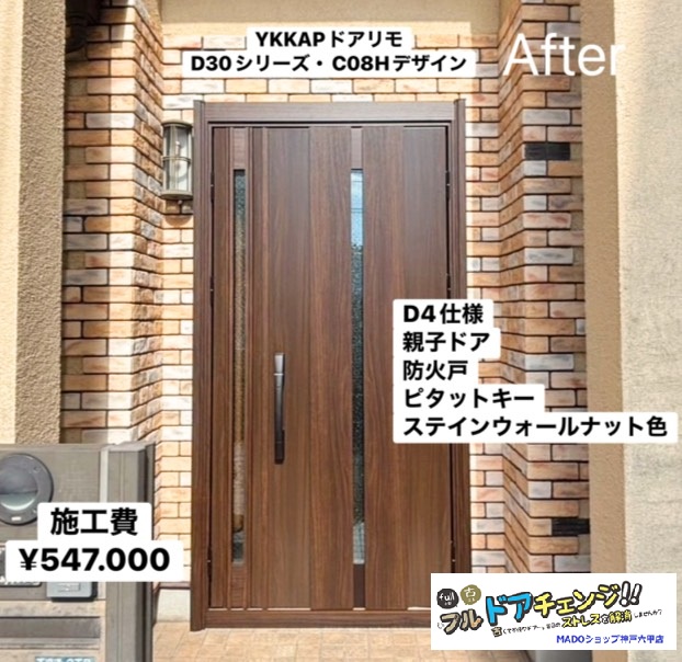 | 施工事例の要約 | 神戸市兵庫区の準防火地域で玄関ドア交換を実施、劣化による開閉音や鍵の不具合を解消。 YKK APドアリモD30(C08H・D4仕様・ピタットキー)採用で快適性と使いやすさが向上。 丁寧な説明・提案力・自社職人施工が決め手となり、ストレスのない玄関環境を実現。 |